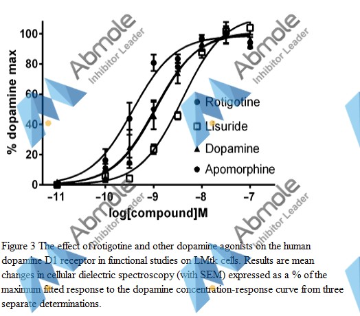 Rotigotine is a potent dopamine receptor agonist with Ki values of 0.71 nM, 4-15 nM, and 83 nM for the dopamine D3 receptor and D2, D5, D4 receptors and dopamine D1 receptor. Rotigotine a partial agonist of the 5-HT1A receptor, and an antagonist of the α2B-adrenergic receptor.