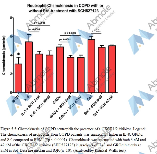 Navarixin (SCH 527123) is a potent and selective antagonist of the human CXCR1 and CXCR2 receptors with IC50 of 42 nM and 3 nM, respectively. SCH-527123 bound with high affinity to the CXCR2 receptors of mouse (K(d) = 0.20 nM), rat (K(d) = 0.20 nM), and cynomolgus monkey (K(d) = 0.08 nM) and was a potent antagonist of CXCR2-mediated chemotaxis (IC(50) approximately 3-6 nM). In contrast, SCH527123 bound to cynomolgus CXCR1 with lesser affinity (K(d) = 41 nM) and weakly inhibited cynomolgus CXCR1-mediated chemotaxis (IC(50) approximately 1000 nM). Oral treatment with SCH527123 blocked pulmonary neutrophilia (ED(50) = 1.2 mg/kg) and goblet cell hyperplasia (32-38% inhibition at 1-3 mg/kg) in mice following the intranasal lipopolysaccharide (LPS) administration. SCH-527123 also suppressed the pulmonary neutrophilia (ED(50) = 1.3 mg/kg), goblet cell hyperplasia (ED(50) = 0.7 mg/kg), and increase in BAL mucin content (ED(50) = <1 mg/kg) in rats after i.t. administration of vanadium pentoxide. In vivo, SCH-527123 treatment decreased tumor growth and microvessel density when compared with vehicle-treated tumors.