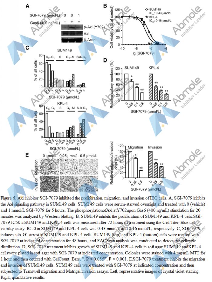 SGI-7079 is a novel Axl inhibitor. SGI-7079 decreased IBC cell proliferation, migration and invasion in vitro and inhibited tumor growth of IBC cells in vivo. Mesenchymal cells also expressed increased levels of the receptor tyrosine kinase Axl and showed a trend toward greater sensitivity to the Axl inhibitor SGI-7079, whereas the combination of SGI-7079 with erlotinib reversed erlotinib resistance in mesenchymal lines expressing Axl and in a xenograft model of mesenchymal NSCLC.