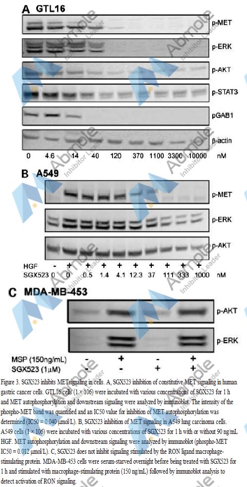 | Preparation method | Scatter and Migration Assays To measure the effect of SGX523 on HGF-induced cell scatter, MDCK cells were plated at 1 × 103 per well in a 24-well plate and incubated at 37°C in 5% CO2 for 1 week in MEM and 10% fetal bovine serum. HGF (90 ng/mL) and various concentrations of SGX523 were added, and the cells were incubated for 18 h (37°C, 5% CO2 humidified incubator) and visualized. To investigate cell migration, A549 cells were plated in 12-well plates (6 × 104 per well) and incubated to confluence. A channel was introduced into the monolayers by scratching with a pipette tip. Various dilutions of compound were added in starve medium in the presence and absence of HGF (90 ng/mL). Twenty-four hours later, wells were checked for cell migration. Cells were stained and visualized as described. |