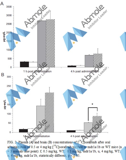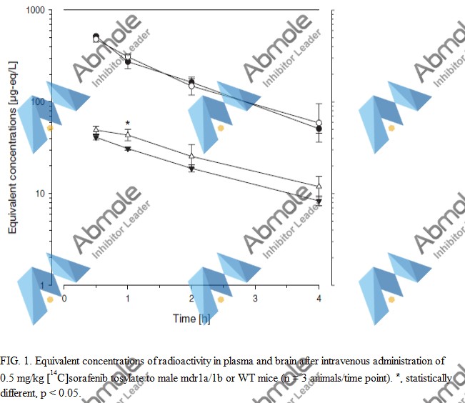 Sorafenib (BAY 43-9006) Tosylate is a dual-action inhibitor that targets RAF/MEK/ERK pathway in tumor cells and tyrosine kinases VEGFR/PDGFR in tumor vasculature. A novel class of biaryl urea that inhibits C-RAF kinase was discovered using a combination of medicinal and combinatorial chemistry approaches. This effort culminated in the identification of the clinical candidate BAY 43-9006 (Sorafenib). Sorafenib inhibited the kinase activity of both C-RAF and B-RAF (wild type and V600E mutant). It inhibited MEK and ERK phosphorylation in various cancer cell lines and tumor xenografts and exhibited potent oral antitumor activity in a broad spectrum of human tumor xenograft models. Further characterization of sorafenib revealed that this molecule was a multikinase inhibitor that targeted the vascular endothelial growth factor receptor family (VEGFR-2 and VEGFR-3) and platelet-derived growth factor receptor family (PDGFR-beta and Kit), which play key roles in tumor progression and angiogenesis.