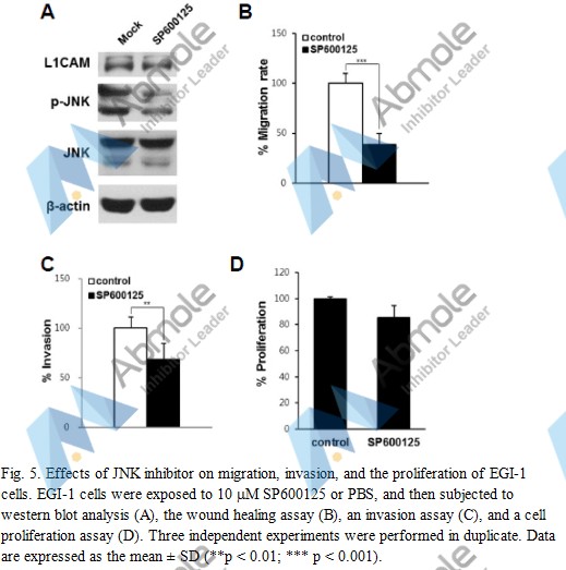 SP600125 is a selective, ATP-competitive JNK inhibitor. SP600125 reversibly inhibits JNK1, 2 and 3 (IC50 = 40 - 90 nM) with negligible activity at ERK2, p38β and a range of enzymes (IC50 > 10 μM). SP600125 potently decreased renal epithelial tubular cell apoptosis induced by renal ischemia/reperfusion via suppression of the extrinsic pathway. In cells, SP600125 dose dependently inhibited the phosphorylation of c-Jun, the expression of inflammatory genes COX-2, IL-2, IFN-gamma, TNF-alpha, and prevented the activation and differentiation of primary human CD4 cell cultures. In mice, SP600125 (15 mg/kg or 30 mg/kg) blocked lipopolysaccharide (LPS)-induced TNF-α expression and anti-CD3-induced apoptosis of CD4(+) CD8(+) thymocytes.