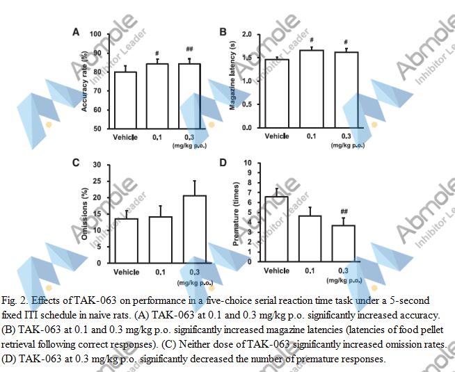 TAK-063 has potent inhibitory activity (IC50 = 0.30 nM), excellent selectivity (>15000-fold selectivity over other PDEs), and favorable pharmacokinetics, including high brain penetration, in mice.TAK-063 at 0.3 and 1 mg/kg p.o., increased cAMP and cGMP levels in the rodent striatum and upregulated phosphorylation levels of key substrates of cAMP- and cGMP-dependent protein kinases. TAK-063 at 0.3 and 1 mg/kg p.o., strongly suppressed MK-801 [(5R,10S)-(+)-5-methyl-10,11-dihydro-5H-dibenzo[a,d]cyclohepten-5,10-imine]-induced hyperlocomotion, which is often used as a predictive model for antipsychotic-like activity in rodents. Upregulation of striatal cAMP/cGMP levels and the antipsychotic-like effect of TAK-063 were not attenuated after 15 days of pretreatment with TAK-063 in mice. The potential side effect profile of TAK-063 was assessed in rats using the clinical antipsychotics haloperidol, olanzapine, and aripiprazole as controls. TAK-063 did not affect plasma prolactin or glucose levels at doses up to 3 mg/kg p.o. At 3 mg/kg p.o., TAK-063 elicited a weak cataleptic response compared with haloperidol and olanzapine.Evaluation of pathway-specific markers (substance P mRNA for the direct pathway and enkephalin mRNA for the indirect pathway) revealed that TAK-063 activated both the direct and indirect pathways of MSNs.