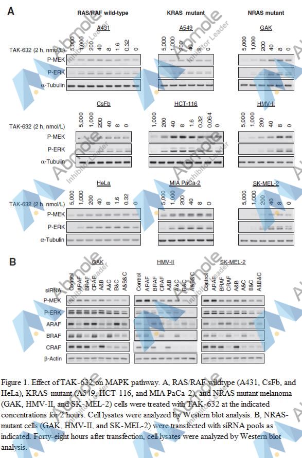 TAK-632 is a selective kinase inhibitor targeting pan-RAF inhibition. TAK-632 inhibited phosphorylation of MEK (pMEK) in melanoma A375 cells (BRAFV600E) with an IC50 value of 12 nM. TAK-632 suppresses RAF activity in BRAF wild-type cells with minimal RAF paradoxical activation. TAK-632 induces RAF dimerization but inhibits the kinase activity of the RAF dimer, probably because of its slow dissociation from RAF. TAK-632 demonstrates potent antiproliferative effects both on NRAS-mutated melanoma cells and BRAF-mutated melanoma cells with acquired resistance to BRAF inhibitors through NRAS mutation or BRAF truncation.