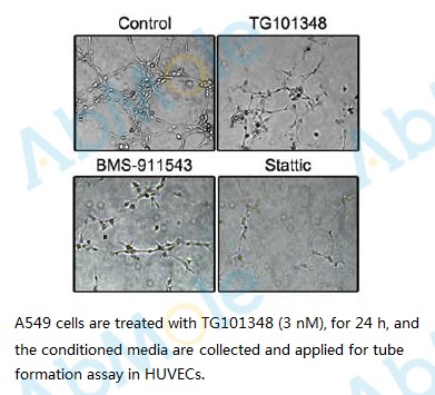 | Preparation method | XTT Assay for Cell Proliferation, Apoptosis, and DNA Laddering Assay Approximately 2~3x10^3 cells were plated into microtiter-plate wells in 100 ml RPMI-1640 growth media with indicated concentrations of inhibitor. Following 72 hr incubation with TG101348, 50 ml of XTT dye were added to each well and incubated for 4 hr in a CO2 incubator. The colored formazan product was measured by spectrophotometry at 450 nm with correction at 650 nm. The concentration in which 50% of the effect (i.e., inhibition of proliferation) is observed (IC50) was determined using the GraphPad Prism 4.0 software. All experiments were performed in triplicate, and the results were normalized to growth of untreated cells. Induction of apoptosis of EpoBa/F3 JAK2V617F, Ba/F3p210, HEL, and K562 cells was determined by DNA fragmentation with DMSO and increasing concentrations of inhibitor. |
