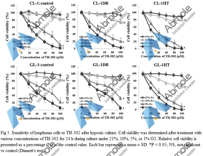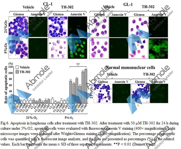 TH-302 is a 2-nitroimidazole triggered hypoxia-activated precursor of the cytotoxin bromo-isophosphoramide mustard (Br-IPM). TH-302 inhibits H460 cells and HT29 cells with IC90 of 0.1 μM and 0.2 μM, respectively. TH-302 exhibits potent cytotoxicity to both human and murine MM cells with hypoxic selectivity and dose dependency, and induces G0/G1 cell-cycle arrest under hypoxic conditions. TH-302 treatment resulted in a reduction in the volume of the HF 48 hours after dosing and a corresponding increase in the necrotic fraction.