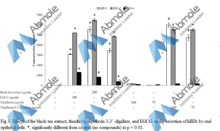 | Preparation method | OBA-9 cells were treated with the black tea extract (150 and 200 μg/ml), theaflavin (75 and 100 μg/ml), theaflavin-3,3’-digallate (75 and 100 μg/ml) or EGCG (100 μg/ml) for 48 h at 37°C in a 5% CO2 atmosphere. Following stimulation, the supernatants were collected, centrifuged (500 x g for 5 min) and stored at -80°C until used. |