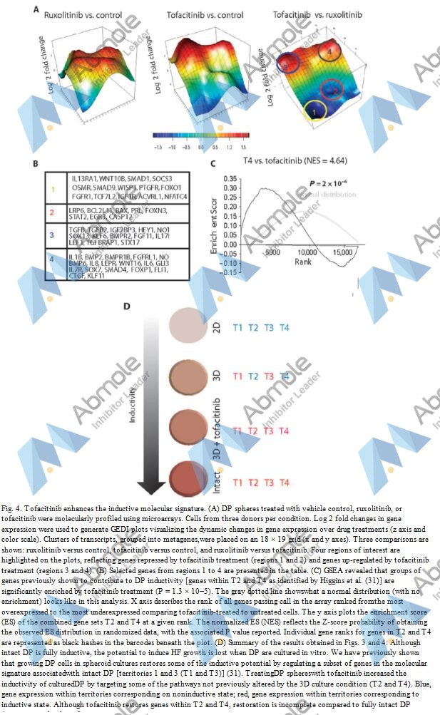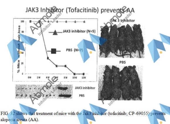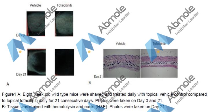 Tofacitinib (CP-690550) is a potent, small molecule inhibitor of JAK-3, which exhibiting potent effects in preclinical transplantation and arthritis models. It displays greater antiproliferative and pro-apoptotic activity against murine multipotent factor-dependent cell Patersen-erythropoietin receptor (FDCP-EpoR) cells harboring JAK2(V617F) compared with JAK2(WT). JAK-3 has been shown to play a key role in cytokine signaling via gammac, e.g. IL-2, 4, 7, 9, 15, 21. In vitro, Tofacitinib effectively inhibited a murine mixed lymphocyte reaction (MLR) (IC50= 91 nm). Mice chronically dosed with CP-690550 (1.5-15 mg/kg/day) demonstrated dose- and time-dependent alterations in lymphocyte subsets when examined by flow cytometry. The most dramatic change observed was a 96% reduction in splenic NK1.1 + TCRbeta- cell numbers following 21 days of treatment. Delayed-type hypersensitivity (DTH) responses in sensitized mice were reduced in a dose-dependent manner following treatment with the JAK-3 inhibitor (1.87-30 mg/kg, s.c.). Extended survival of neonatal Balb/c hearts implanted into the ear pinna of MHC mismatched C3H/HEN mice was observed with CP-690550 monotherapy (10-30 mg/kg/day), but improved upon combination with cyclosporin (10 mg/kg/day). Furthermore, the ability of Tofacitinib to extend cardiac allograft survival in murine models suggests it may afford a new treatment for prevention of transplant rejection.