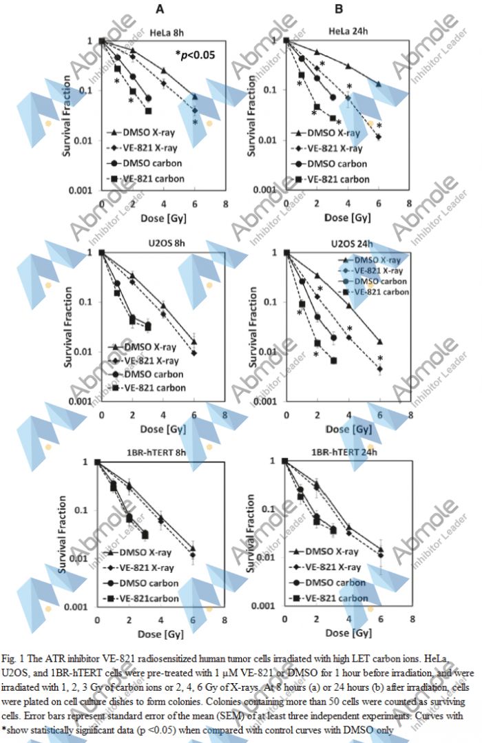 VE-821 is a novel ATR inhibitor. VE-821 was shown to inhibit ATR-mediated signalling in response to replication arrest induced by severe hypoxia. VE-821 inhibited radiation- and gemcitabine-induced phosphorylation of Chk1, confirming inhibition of ATR signaling. ATR inhibition by VE-821 led to inhibition of radiation-induced G 2/M arrest in cancer cells. Consistently, VE-821 significantly enhanced the sensitivity of PSN-1, MiaPaCa-2 and primary PancM pancreatic cancer cells to radiation and gemcitabine under both normoxic and hypoxic conditions. VE-821 induced DNA damage and consequently increased Ataxia Telangiectasia Mutated-mediated phosphorylation of H2AX and KAP1. Most importantly, VE-821 increased radiation-induced loss of viability in hypoxic conditions. Reduced cancer cell radiosurvival following treatment with VE-821 was also accompanied by increased DNA damage and inhibition of homologous recombination repair, as evidenced by persistence of γH2AX and 53BP1 foci and inhibition of Rad51 foci, respectively.