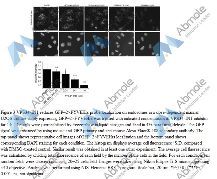 Administration of VPS34-IN1 to cells induces a rapid dose-dependent dispersal of a specific PtdIns(3)P-binding probe from endosome membranes, within 1min, without affecting the ability of class I PI3K to regulate Akt. It can also induce a rapid ~50-60% loss of SGK3 phosphorylation within 1min. VPS34-IN1 has no inhibition to the SGK2 isoform that does not possess a PtdIns(3)P-binding PX domain.