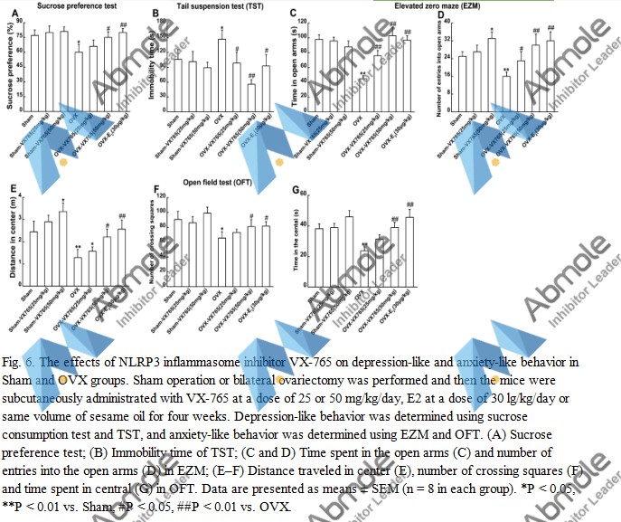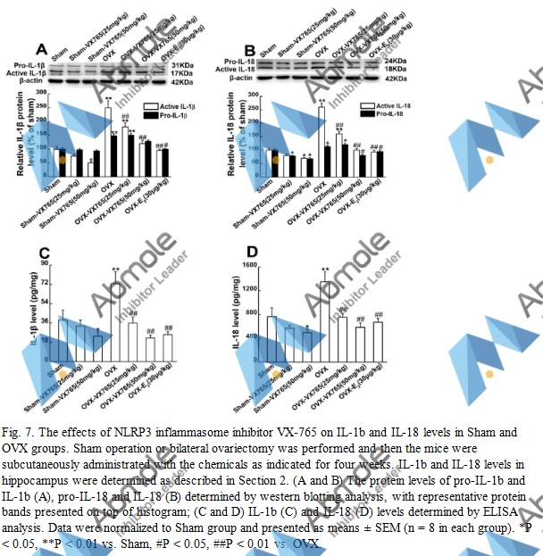 In addition, VX-765 reduced disease severity and the expression of inflammatory mediators in models of rheumatoid arthritis and skin inflammation. Belnacasan reduces inflammatory response in murine models of inflammatory disease. Belnacasan (50-200 mg/kg) significantly reduces serum IL-1β levels by as much as 60%. It is noteworthy that the effect of Belnacasan on the release of IL-1β induced by LPS reached a plateau at 100 mg/kg.