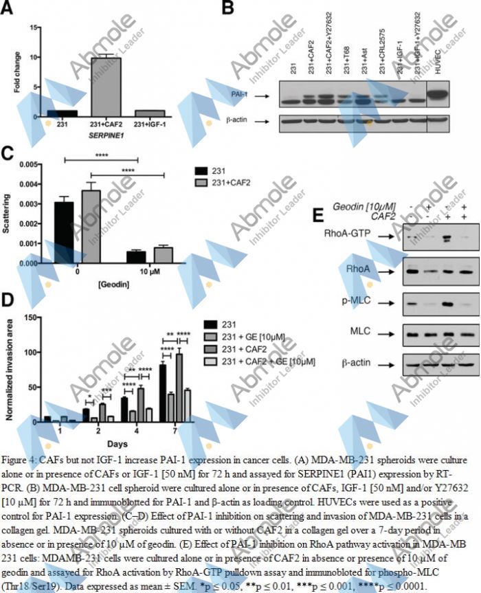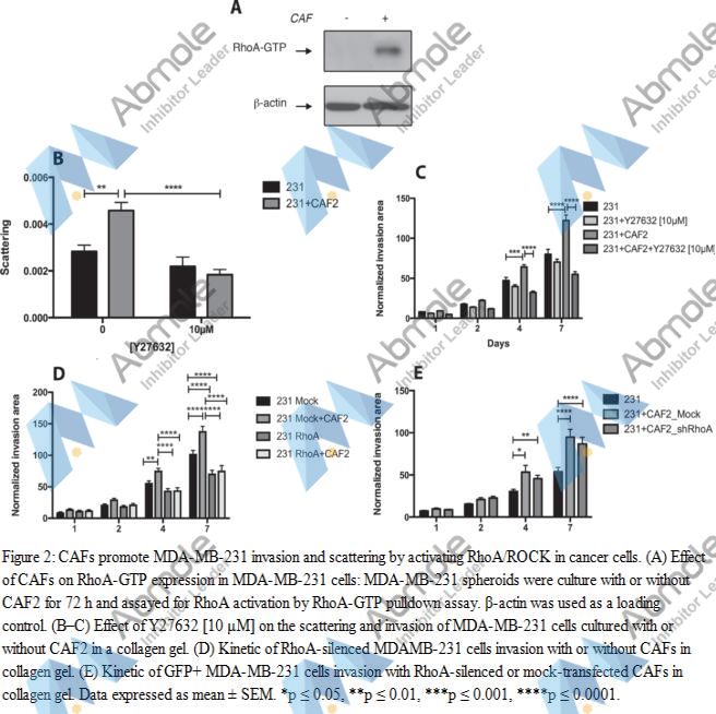 The crosstalk between breast carcinoma-associated fibroblasts and cancer cells promotes RhoA-dependent invasion via IGF-1 and PAI-1.